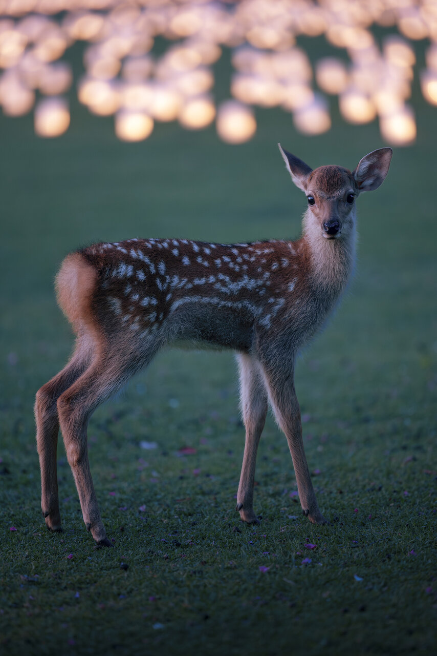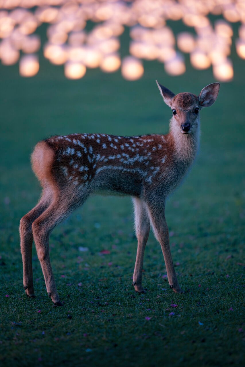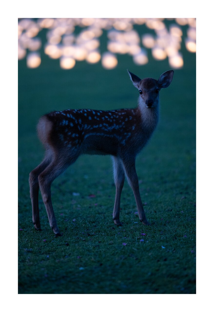 「奈良で毎年8月に開催されている『なら燈花会』での一枚です。夜に並ぶたくさんの蝋燭が美しいイベントで、その灯りと鹿を組み合わせた写真を撮りたいと思っていました。夜の雰囲気がギリギリ残る時間帯での撮影で、それ以上暗くなるとノイズが出てしまうため、まさにタイミング勝負。人が写り込まず、蝋燭と鹿が一緒に入り、なおかつ鹿がこちらを向いてくれた、絶妙な瞬間を捉えることができました。