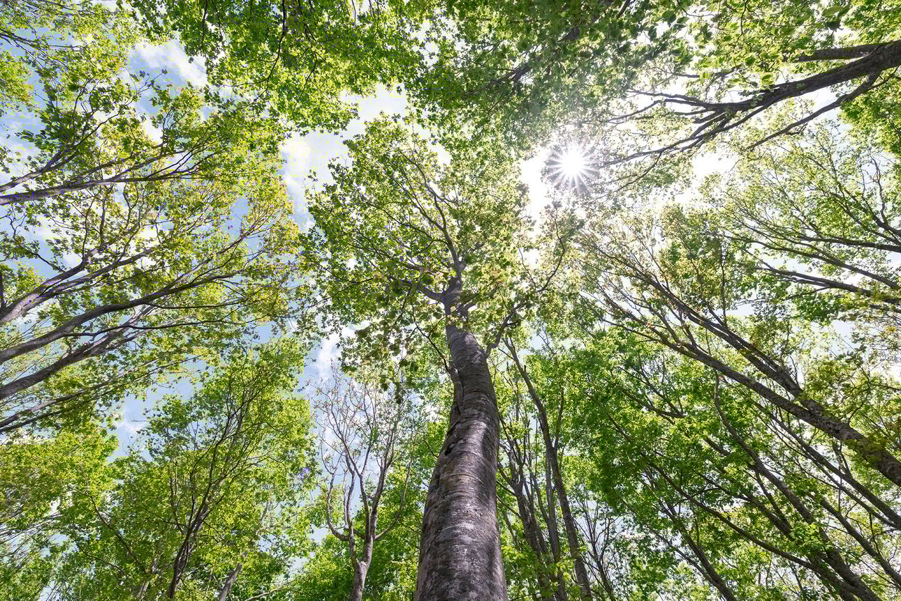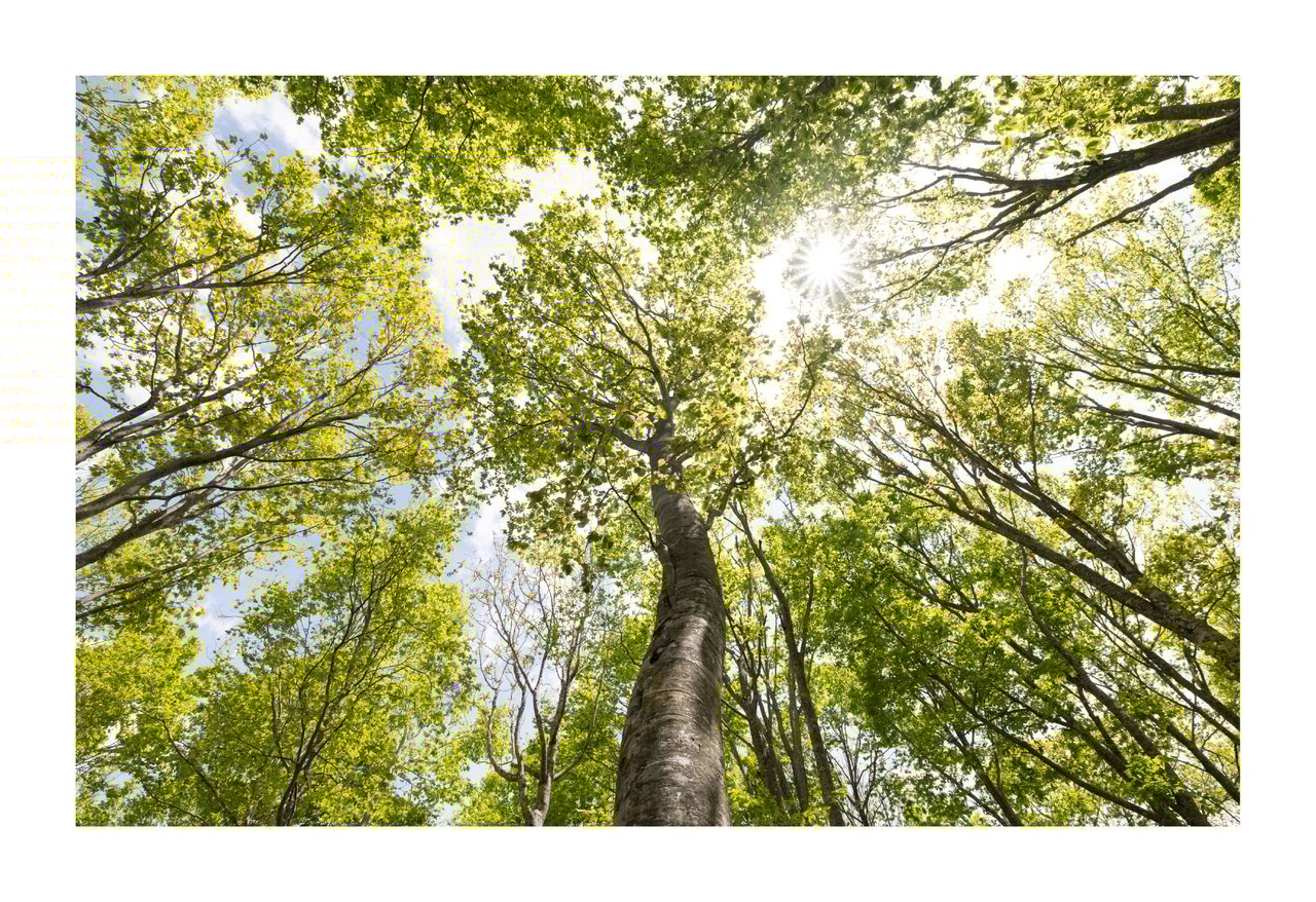 ど真ん中に力強く伸びているブナと、その周囲の細い木々との対比によって、主題と副題が分かれて見えるところがお気に入りポイントです。実際は、木の太さはどれも同じなのですが、メインの木の真下からカメラを構えたことで、この1本だけが太く写っているんです。こういうときって、大体最初にシャッターを切った一枚が一番よかったりするんですよね。この写真もまさにそうで、最初に“いいな”と思った直感を信じることの大切さを、あらためて感じました」。