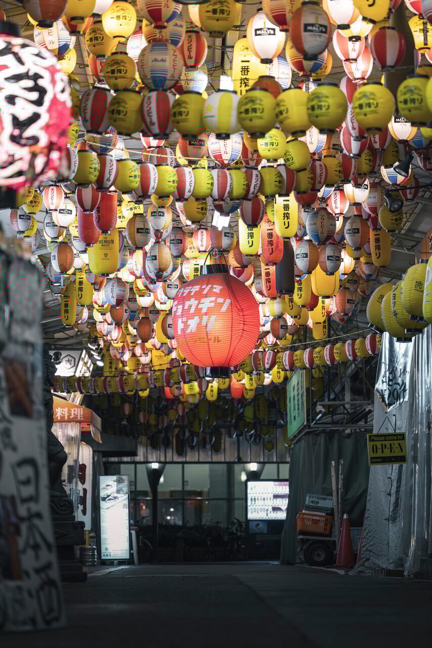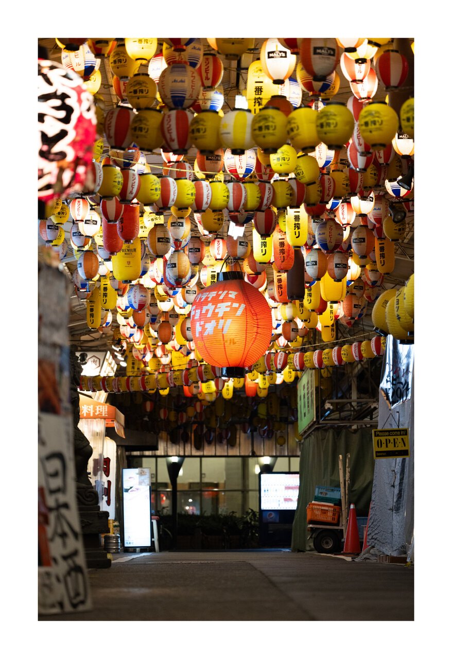 「大阪の人気フォトスポット、裏天満ちょうちん通りでの写真です。写真を始めて間もない頃にもこの場所を訪れ、広角レンズや標準レンズでいろいろ試してみたのですが、なかなか納得のいく写真が撮れませんでした。このときは、フォトグラファーとして少し成長できたと感じていたタイミングでもあり、バランスよく構図を組むことができました。左上には焼き鳥の提灯、左下には看板を配置し、焦点距離100mmの望遠レンズを使って圧縮効果を狙っています」。