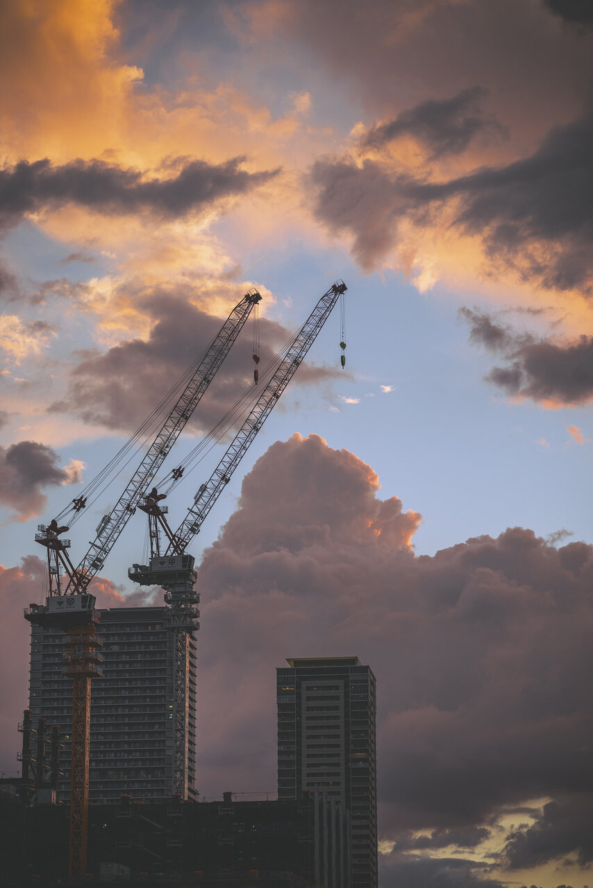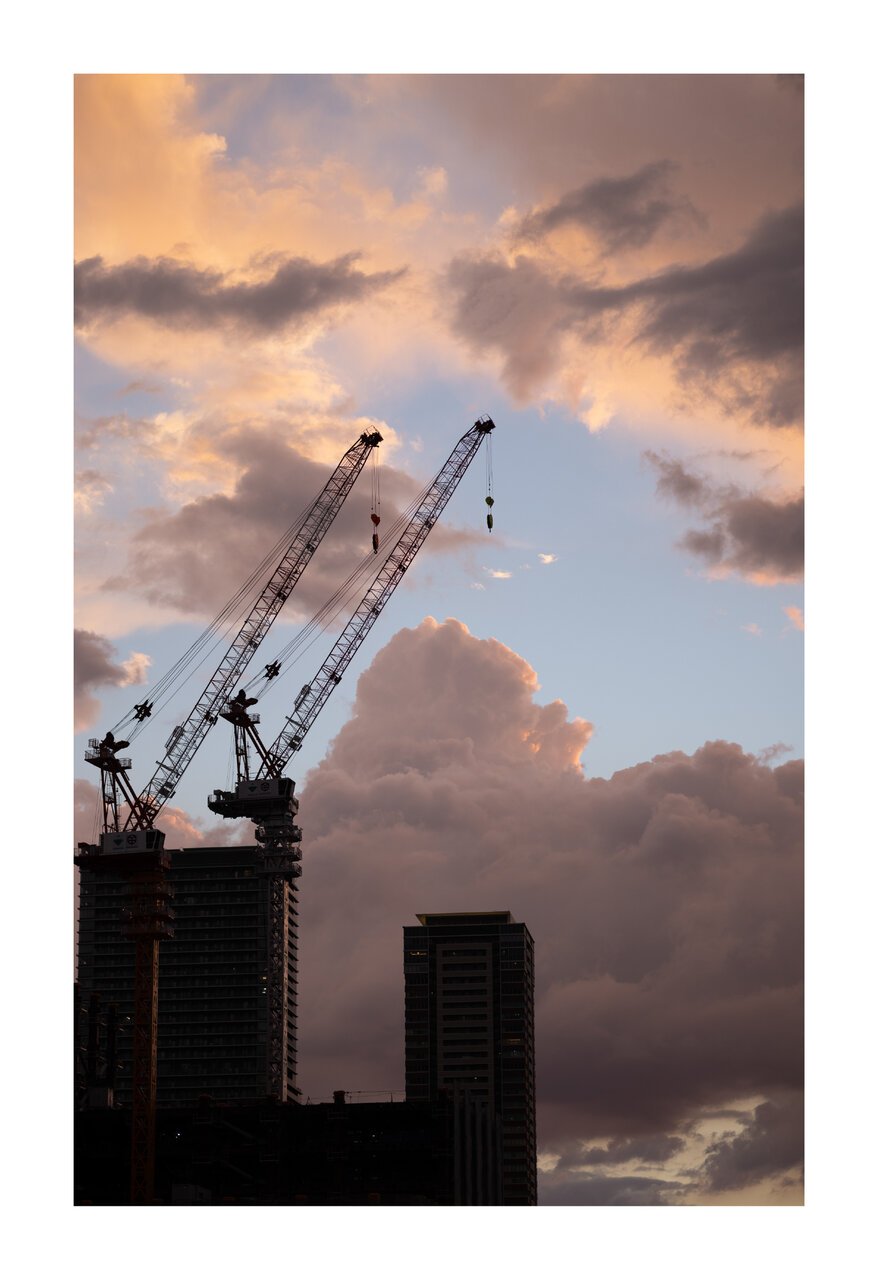 「2〜3年前の梅田で、建設中の様子を撮影した一枚です。ビルが完成してしまえば見られなくなる、今だけの景色だと思いカメラを向けました。背景には、夕焼けで雲が色づいているのに、空は青さを保ったままで、青とオレンジのコントラストがとても印象的でした。