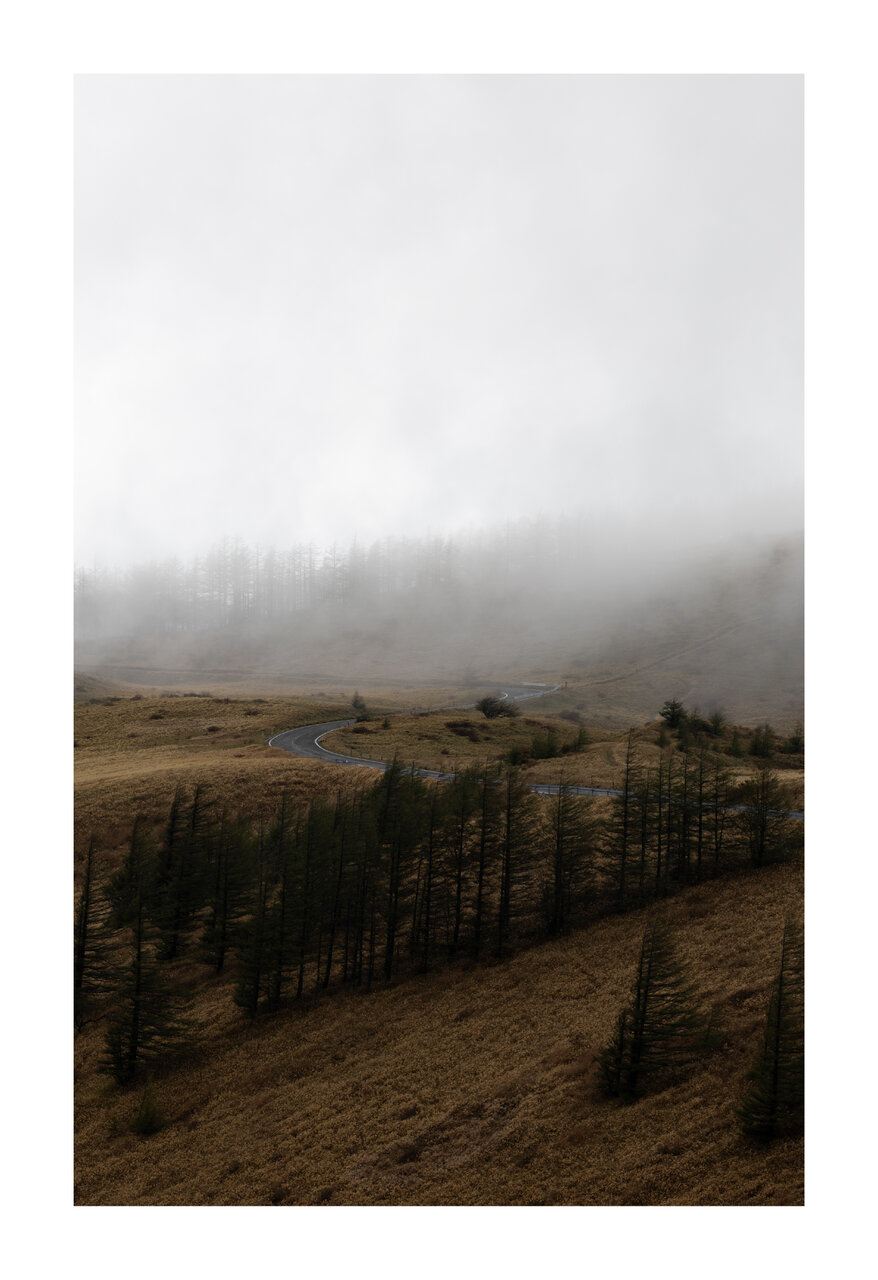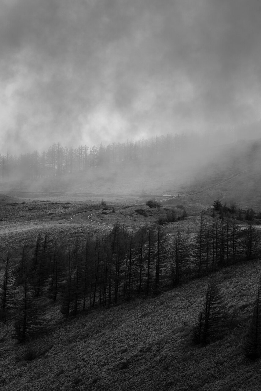 「長野・美ヶ原高原に向かう途中での一コマ。悪天候で風も雨も強く、美ヶ原高原での撮影を断念して引き返していたのですが、途中で霧が出てきました。ふと外を見ると、木々が美しく整って生えていて、その奥に続くS字の道との組み合わせがとても印象的で。車を止めてもらい、すぐに撮影しました。カラーで撮影した段階でも気に入っていたのですが、今回はSilver Efexを使ってモノクロに仕上げてみました。構図がきれいだったので、色がなくても成立するのではと思って試してみたところ、ぐっと雰囲気が深まり、どこか海外のような印象に仕上がりました」。