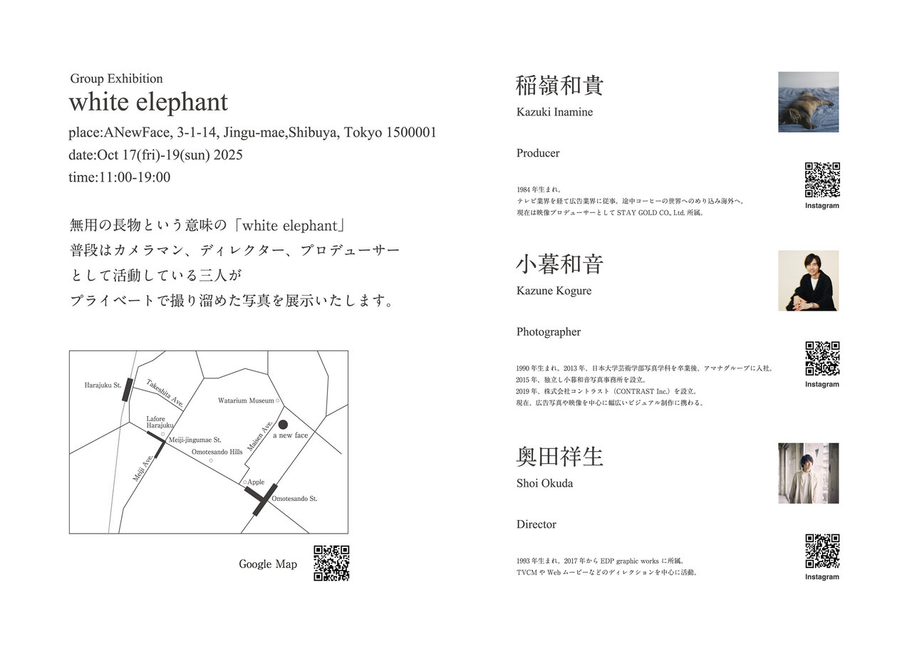 無用の長物という名を冠した、広告・映像業界で活躍する3名による写真展。広告や映像の現場で日々“目的のある表現”を追求してきた3人が、「目的のない写真」を通して、もう一度“自分の目”を確かめたいと思った。そんな想いから生まれたのが本展「white elephant」だ。普段の制作ではデジタルワークフローが中心だが、あえて“手のかかる”フィルムで撮り続けてきた。しかし現像されたネガの多くは、選ばれることもなく引き出しの奥に眠り続けている。それら“使われなかった写真”こそ、まさに無用の長物=white elephant。けれど、そこには誰にも見せようとしなかった“本来の視点”が確かに存在していた。