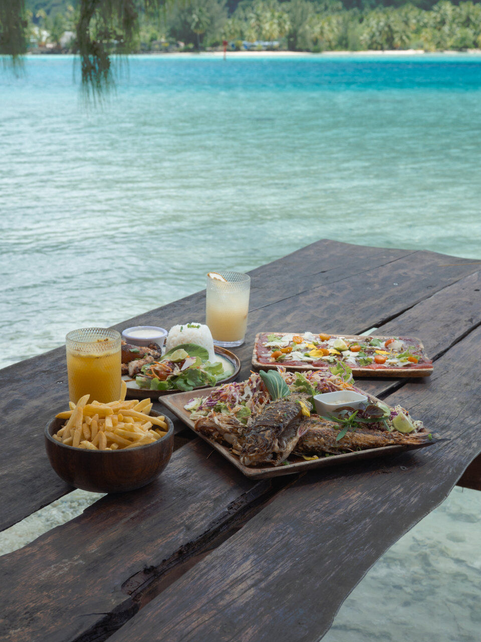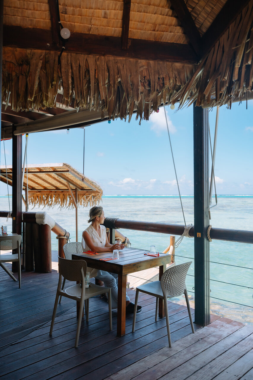 このレストランは、何よりもまずロケーションが最高でした。ビーチサイドというより、テーブルによってはまるで海の中にいるかのように感じるほど、水との距離がとても近いです。穏やかなタヒチの海だからこそ実現できる空間だと感じました。アクティビティとレストランの境界がいい意味で曖昧で、食事をしながらも非日常の時間を味わえる場所。船でしか行けないというアクセスも、その特別感をさらに高めてくれました。