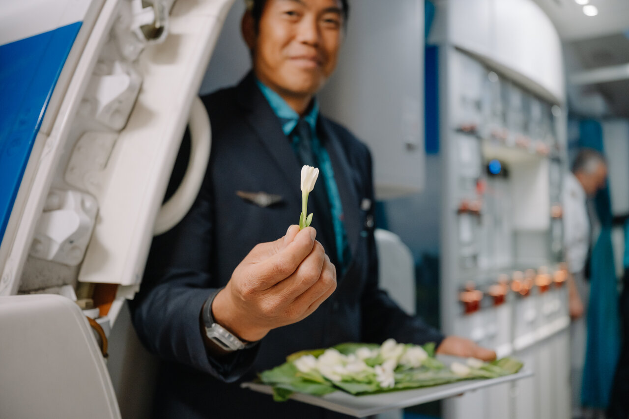 搭乗時には、ウェルカムフラワーとしてタヒチの国花「ティアレ」が手渡しで贈られます。ふわっと広がる、やさしく甘い香りに癒やされながら、タヒチへの気持ちが高まり、これから始まる旅への期待がアップします。
