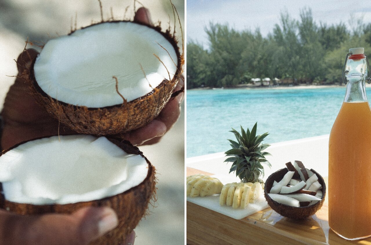 途中で船を降りて立ち寄る島では、ガイドがヤシの実を割り、採れたてのココナッツウォーターを振る舞ってくれる場面も。シュノーケリング後には、ドリンクやパイナップルなどの軽食が用意され、南国の味を楽しみながらひと息つけます。