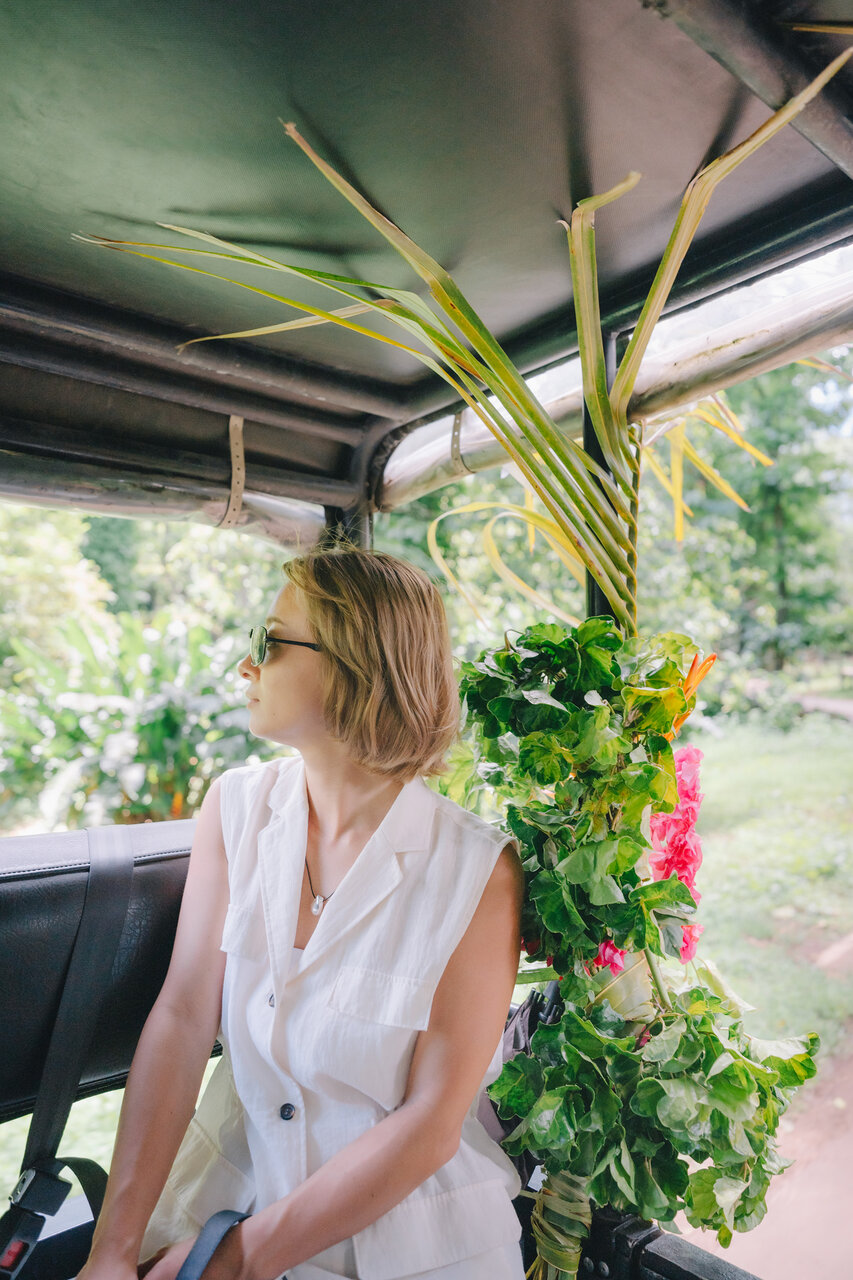 ブーゲンビリアで華やかに飾られた車に乗り込み、いざツアーへ。