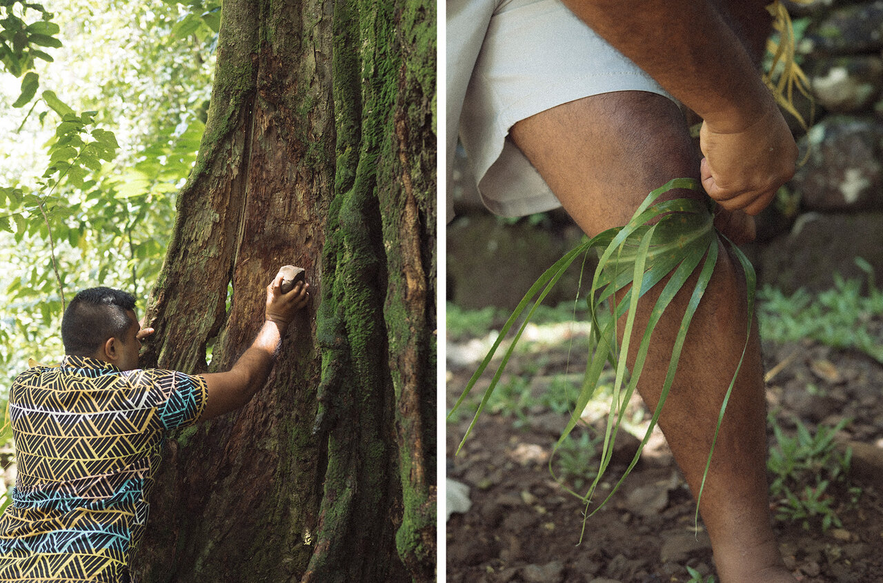 ガイドによる解説と実践の時間。石を木に打ち付けて儀式の始まりを告げる合図が、静かな森に響き渡ります。マラエを囲む「アウティリーフ(Au'ti Leaf)」は、魔除けや浄化を意味する神聖な植物。儀式やタヒチアンダンス、ハカの衣装にも使われています。