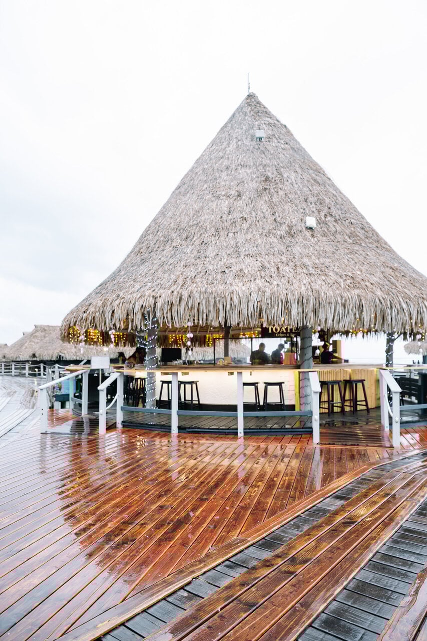 ホテル「ヒルトン・モーレアラグーン・リゾート&スパ」内にある、水上のクレープバー「トアテア・クレープリー&バー(Toatea Crêperie & Bar)」。足元にはサメや小さな魚が泳ぎ、この土地ならではのロケーションが楽しめます。