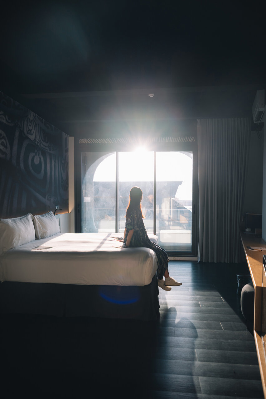 部屋に入るとカーテンが自動で開き、オーシャンビューの窓からは、目の前に港の風景が広がります。開放的で清潔感のある客室は、壁にタヒチらしい模様があしらわれるなど、ローカルな雰囲気も感じられつつ、スタイリッシュなデザインが印象的です。
