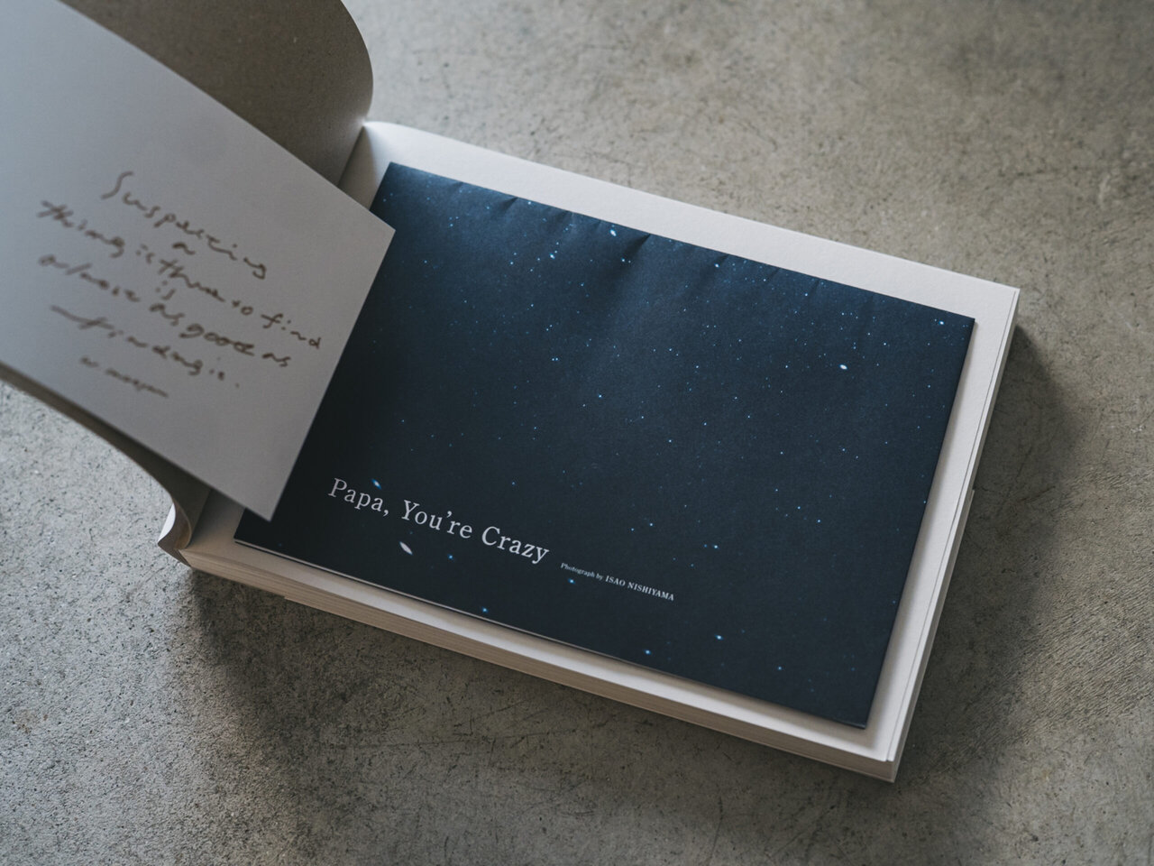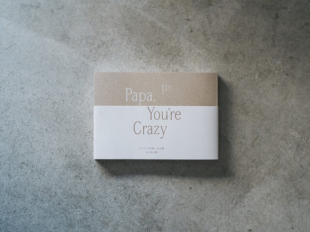 1957年に出版されたアメリカの作家ウィリアム・サローヤンの小説『Papa, You’re Crazy』を題材に、西山が父親と長崎・平戸の離島で過ごした夏の日々を捉えた写真集。島で生活する父を写した写真群と共に、小説からの引用、家族写真の断片、巻末のエッセイで構成される本作では、フィクションを意図的に織り交ぜた撮影手法によって、不確かで歪な父親との関係性がどこか違和感を伴う父の肖像として描かれる。原作小説で描かれるそれとは相反する父親と息子のいびつな関係性が、演者と撮影者という“架空の物語を創作する”ための協働関係を結ぶことにより奇しくも極めて現実的で言葉にし難い父子のありようを浮き彫りにしている。