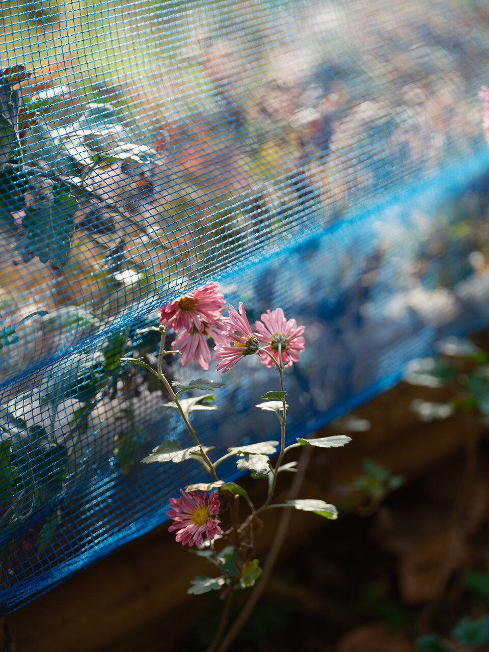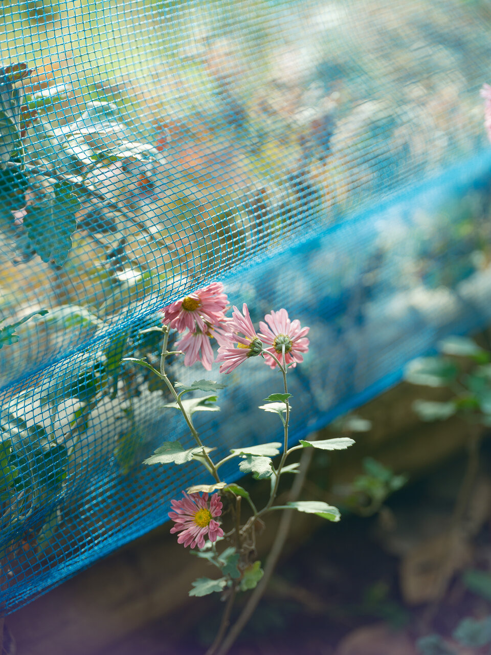 歩いているときに見つけた道端の花。小さな花びらがたくさんついた花とネットの青色との相性に惹かれて撮影しました。彩度が低めのパステルチックな印象を目指し露出はやや上げ気味で、角度を調整してうっすらとピンク色のゴーストを出しています。花のピンクとゴーストがマッチして可愛い印象になりました。写真全体が柔らかく、緑も馴染み、ノスタルトーン・グリーンは花との相性がいいレンズフィルターだと感じました。