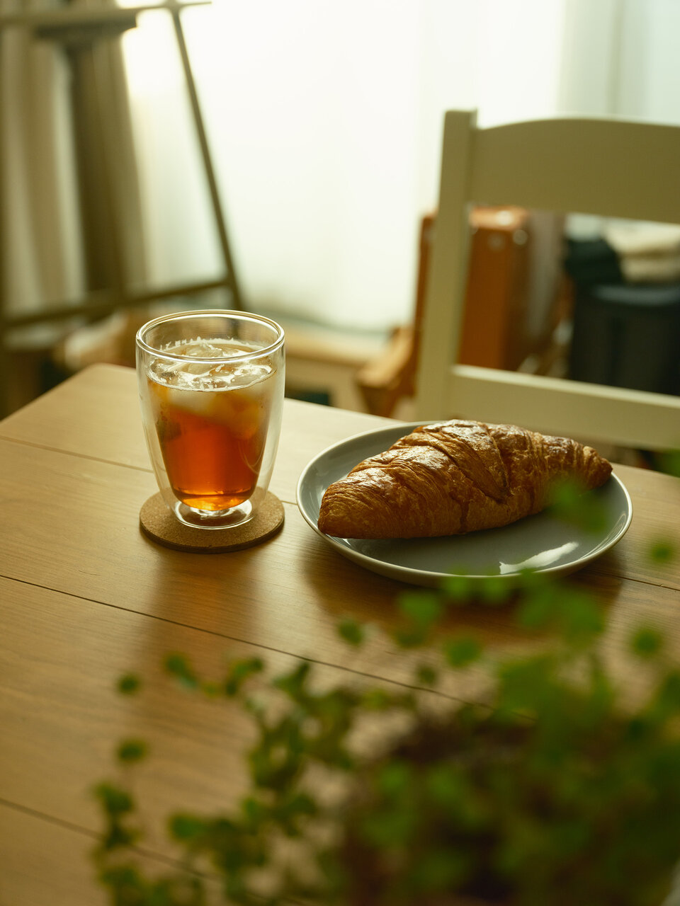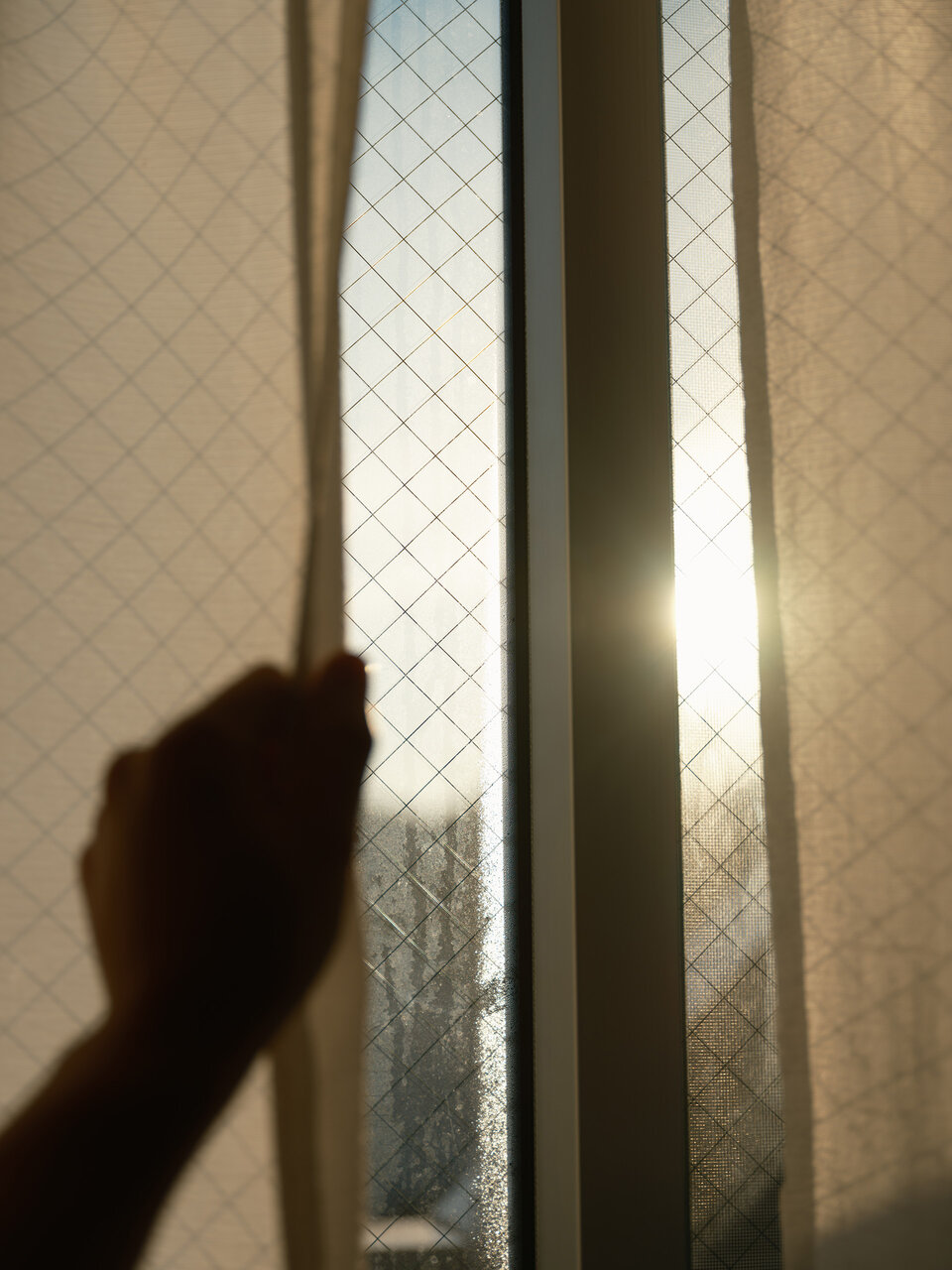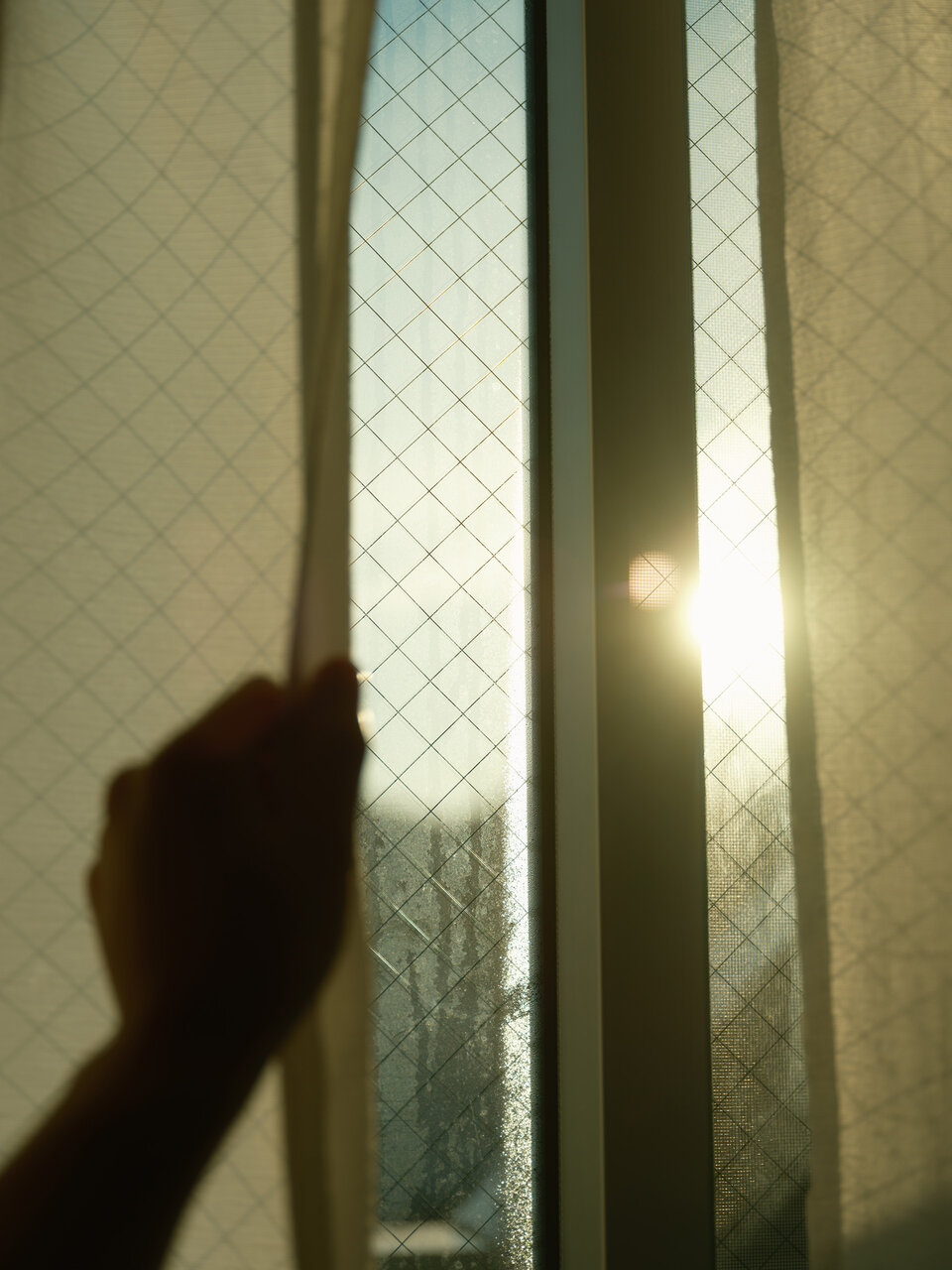 朝の7時ごろ、起きて自宅のカーテンを開けるシーンです。カーテンを少し開けたときに入り込んでくる美しい朝日そのものと、朝日によって光る窓の結露に惹かれました。一日の始まりや日常感を感じられるよう、手を入れて撮影しています。日が昇ってくると、暗がりの青からだんだん黄色味がかってきます。その黄色味は夕日が落ちるときのオレンジとは違って、緑がかった黄色というイメージを持っています。なかなか表現しにくく編集が必須となるシーンなのですが、ノスタルトーン・グリーンを使用すると自然に表現できました。また、ゴーストが写真の印象を深めてくれています
